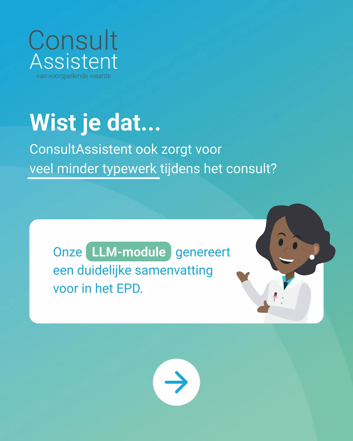 ConsultAssistent zorgt voor veel minder typewerk tijdens het consult. Dit doen we door de antwoorden op de gestandaardiseerde auto-anamnese via onze LLM-module om te zetten in een medische samenvatting. Die wordt op dezelfde manier opgesteld als het uiteindelijke consultverslag, met duidelijke kopjes zoals hulpvraag, voorgeschiedenis, familie-anamnese, allergieën en intoxicaties. De arts hoeft deze samenvatting aan het einde van het consult alleen nog te controleren, daar waar nodig aan te vullen en op ‘verstuur naar het EPD’ te klikken. De samenvatting wordt dan direct in de EPD Consultvoering geschreven.